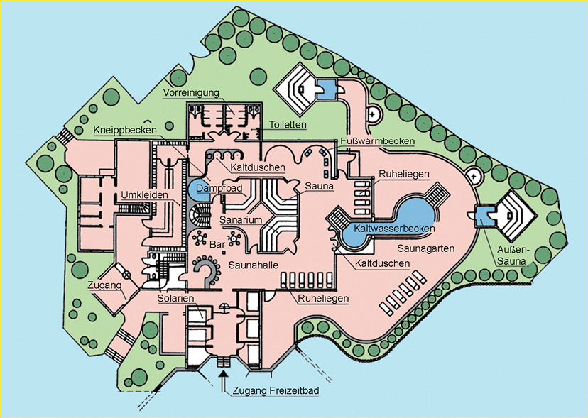 Zur Anlage sollten Kommunikationseinrich-tungen (Leseräume und Bars) und ein großer Außenbereich (Saunagarten mit Blockhaussau-na und Außenbecken oder Naturbäder) gehören.