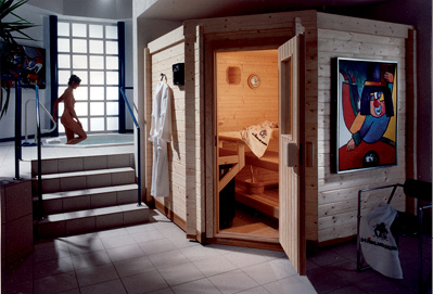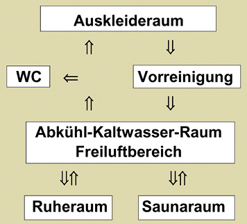 Die Einbeziehung der Sauna erfolgt als ge-schlossene Einheit, die sowohl vom Bade-gast, wie auch vom speziellen Saunabesucher genutzt werden kann. Die Einrichtung einer Anlage mit zwei Saunaräumen bietet sich an. Diese werden getrennt für beide Geschlechter oder zur gemeinsamen Nutzung betrieben.