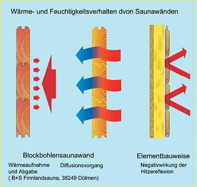 Schema des Wärme-Feuchtigkeitsverhal-tens von Saunawänden (Foto: B+S Finnlandsauna)