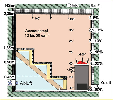 Klima in einer Sauna (Schema nach den Richtlinien für den Bau von Saunaanlagen)