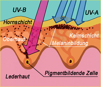 Der UV-A-Anteil wandelt die Pigmentvorstu-fe in das braune Farbpigment Melanin um. UV-C ist im Sonnenlicht in Erdnähe nicht mehr vorhanden.