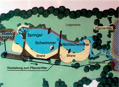 Lageplan eines künstlichen Badeteiches, be-stehend aus einem Pflanzenfilter, anschließender So-larstrecke zur Erwärmung, Nichtschwimmer-, Schwim-mer- und Springerbereich. Der Zulauf erfolgt in den Planzenfilter durch Quellwasser und Zirkulationswas-ser über die Rückleitung per Pumpe. (Höhr-Grenzhau-sen)