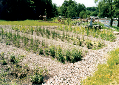 Verschmutztes Oberflächenwasser wird im anschließenden Absetzbereich oder separa-tem Becken gesammelt und von absetzbaren Bestandteilen gereinigt. Der Schlammbereich ist mindestens einmal jährlich zu räumen. Das Wasser fließt ab oder wird aus einem ange-schlossenen Ausgleichsbecken wieder auf den Pflanzenfilter gepumpt.