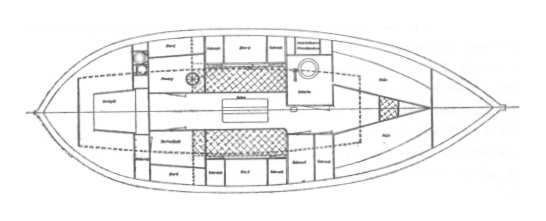 Auf der Backbordseite befanden sich: die Kombüse, eine Koje, davor eine Bank, im Vorschiff ein Bücherschrank, ein Fotoschrank, eine Bank und ein Schrank für Werkzeuge. Ganz vorn im Schiff lag die Vorpiek mit Raum für Segel, Ankerkette und Ankertrosse. An den Motorenraum schlossen sich achtern die Plicht an, zwei Tanks für Treibstoff und ein Wassertank im Achterpiek.
