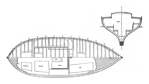 Soweit es ging, schaute ich selbst nach dem Bau; ich war dabei, als die Werft den gußeisernen Kiel legte, die Eichenspanten – teils „gewachsene“, teils im Dampf gebogene – setzte und die Außenhaut – 3 cm dicke Gebirgslärchenplanken – an die Spanten vernietete. Das Deck wurde aus Teakholz, die Aufbauten und die Inneneinrichtung aus afrikanischem Mahagoni hergestellt: auf der Steuerbordseite der Kartentisch, eine Eckbank, über der drei größere Borde eingebaut wurden, im Vorderschiff eine Koje, zwischen Mast und Koje ein Kleiderschrank, ein Schrank für Ersatzteile und Bücher.