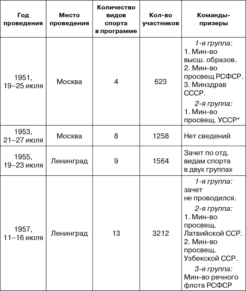 Своего рода смотром «глубокого боевого резерва» для сборных команд страны стало проведение в 1951–1960-м годах четырех Всесоюзных студенческих Спартакиад – по две в Москве (1951 и 1953 гг.) и Ленинграде (1955 и 1957 гг.) и двух Всесоюзных студенческих игр в Киеве (1958 и 1960 г.). И если в программе первой спартакиады было лишь 4 вида спорта (лёгкая атлетика, гимнастика, плавание и баскетбол) и участвовали только 623 спортсмена, то постепенно соревнования становились всё более популярными и массовыми. Так, через 2 года в программу добавили состязания по прыжкам в воду, волейболу, боксу и велосипедному спорту, и в них приняли участие уже 1258 студентов. В третьей Всесоюзной спартакиаде вузов прошли соревнования по 9 видам спорта (в программу включили дополнительно фехтование и борьбу классическую), в которых победу оспаривали 1564 студента (среди них 5 заслуженных мастеров спорта, 49 мастеров спорта, 1190 перворазрядников) из сборных команд 47 вузов. Наибольших успехов добились представители Ленинградского института физической культуры им. П.Ф. Лесгафта, победив в состязаниях по лёгкой атлетике, гимнастике, плаванию.
