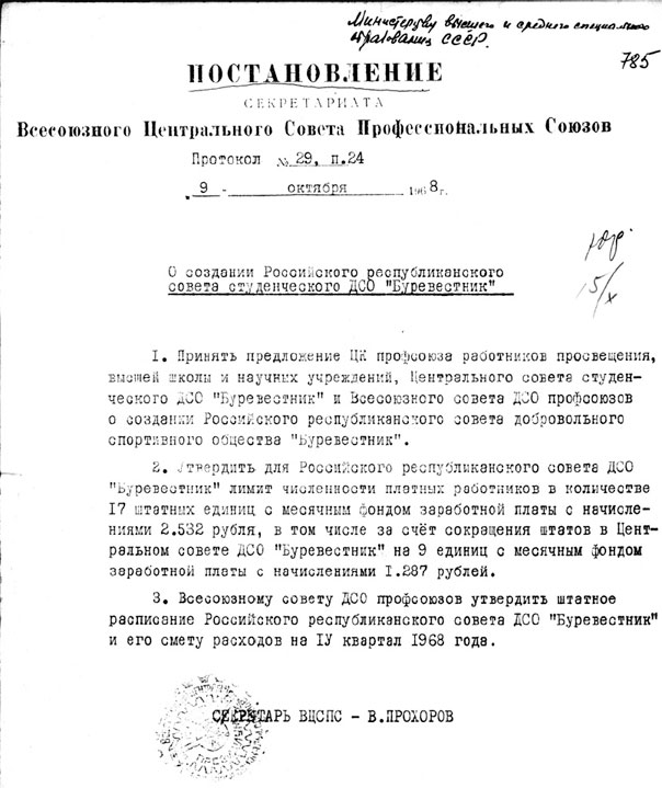 В октябре 1968 г. постановлением секретариата ВЦСПС был создан Российский республиканский совет студенческого ДСО «Буревестник». Его возглавил заместитель заведующего отделом физкультуры и спорта ВЦСПС Юрий Владимирович Генерозов.