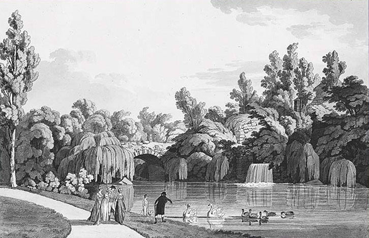 Wasserfälle bei der Grotte des Schlossparks Schönau, um 1800