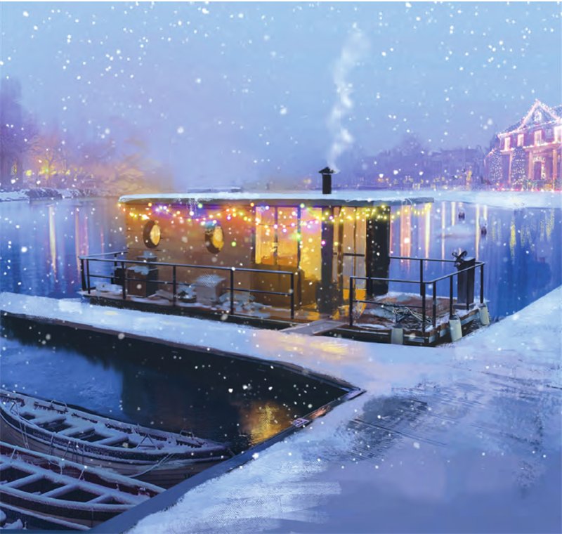 Дом Каролине представлял собой небольшое плавучее жилище из дерева и стали. Стены были обиты крашенными в коричневый досками, большие окна занимали пространство от палубы до плоской заснеженной крыши. Из небольшой трубы струился дымок.