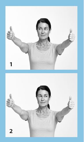 1. Примите вертикальное положение, ноги на ширине бедер. Расправьте и расслабьте спину. Дышите плавно и равномерно. Вытяните обе руки вперед на уровень глаз и поднимите большие пальцы вверх. Сосредоточьте взгляд на большом пальце правой руки.