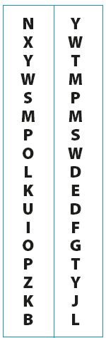 Чтобы сделать тренировку движений глаз более разнообразной и интересной, можно использовать специальные карточки для саккад. Взгляд должен прыгать попеременно от строчки к строчке и от одной буквы к другой. Начинайте слева направо. Такой метод движения глаз требует большего внимания и более точной координации глаз, потому что при каждом «прыжке» нужно найти правильную букву в правильной строчке. Это также способствует большей активности лобной доли мозга.