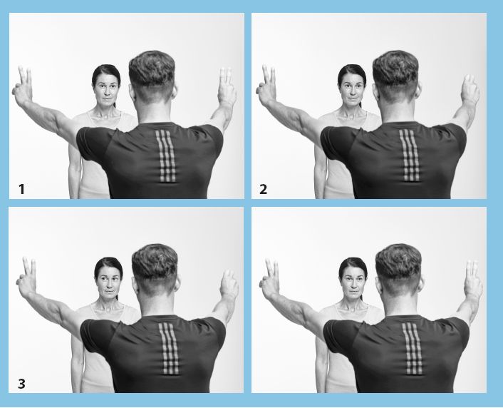 1. Примите вертикальное положение, ноги на ширине бедер. Расправьте и расслабьте спину. Дышите плавно и равномерно. Ваш партнер должен стоять примерно в полутора метрах от вас, его руки располагаются на уровне глаз. Сначала расслабленно направляйте свой взгляд на лоб партнера или (в зависимости от роста партнера) на подбородок.