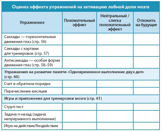 Для этого выберите одно-два упражнения с наиболее выраженным положительным эффектом и уделите им от двух до пяти минут (в зависимости от их интенсивности) в самом начале тренировки. Функциональность лобной доли головного мозга можно улучшить при помощи описанных в предыдущей главе игр и приложений (стр. 61). Для этого необходимо ежедневно выделять на тренировку в среднем по 10 минут и выполнять указанные игровые упражнения 4–5 раз в день по 2–3 минуты, например, в рабочий перерыв или в свободное время.