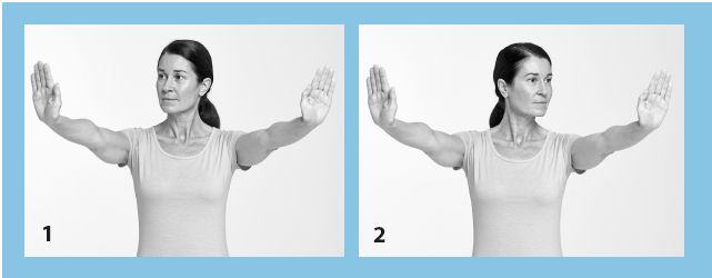 1. Встаньте прямо, ноги на ширине бедер. Расправьте и расслабьте спину. Дышите плавно и равномерно. Находясь в исходном положении, выберите две точки, расположенные справа и слева от вас на уровне глаз. Можно использовать в качестве ориентира вытянутые руки. Для начала упражнения поверните голову и взгляд одновременно в правую сторону.