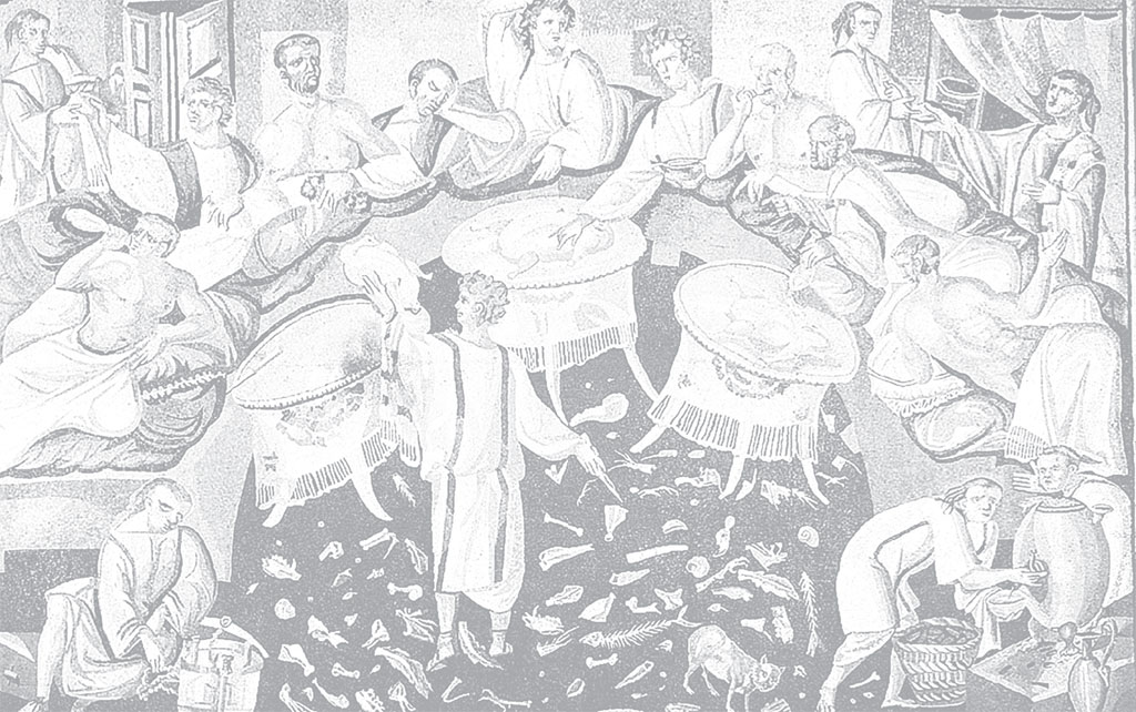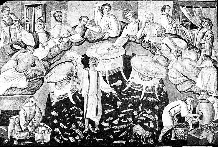 Отметим сразу, что подобная картина, которую из раза в раз рисуют нам ностальгирующие авторы времен Раннего Средневековья, конечно же, далеко не всегда соответствовала действительности. В самом Риме роскошь и пьянство среди высших классов порой становились притчей во языцех, в чем может убедиться каждый, открыв прославленное описание пира у нувориша Тримальхиона. Вино в подобных случаях лилось рекой, столы ломились от снеди, не столь изысканной, сколько «дорогой и богатой», и также не ощущалось недостатка в женщинах известного сор-та. Кроме того, привычки равенства и взаимного уважения, о которых также из раза в раз вздыхали радетели «любезной старины», постепенно уходили в прошлое. Гости все заметнее делились на категории, а блюда особенно лакомые могли быть поданы только приглашенным за хозяйский стол, а порой и вовсе – одному только хозяину. Вспомним, какой гнев возбуждает у Марциала тот факт, что кабана, огромное блюдо, «предназначенное для дружеской пирушки», подают исключительно хозяину дома. «У тебя прекрасный собеседник», – язвит поэт, но, как вы понимаете, дела это не меняет.