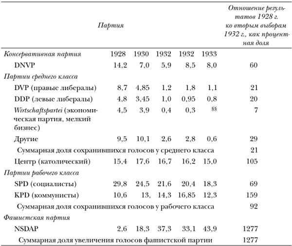 Хотя такого рода таблица скрывает изменения, вносимые лицами, которые идут против общей статистической тенденции, некоторые разумные выводы на сей счет все-таки могут быть сделаны. По мере того как сила нацистов росла, либеральные партии буржуазного центра, базирующиеся на менее традиционалистских элементах немецкого общества – в первую очередь на мелких бизнесменах, служащих и работниках умственного труда, – неумолимо двигались к полному краху. В период между 1928 и 1932 гг. эти партии потеряли почти 80 % своих избирателей, и их доля в суммарном количестве голосов сократилась от одной четверти до менее чем 3 %. Единственной центристской партией, сохранившей свою долю электората, была партия католического центра, поддержка которой подкреплялась религиозной преданностью ее адептов. Марксистские партии, т. е. социалисты и коммунисты, потеряли приблизительно одну десятую общей процентной доли своей поддержки, хотя суммарное голосование за них сократилось лишь незначительно. Уровень пропорциональной поддержки консерваторов снизился примерно на 40 % – намного меньше, чем указанный показатель у более либеральных партий среднего класса.