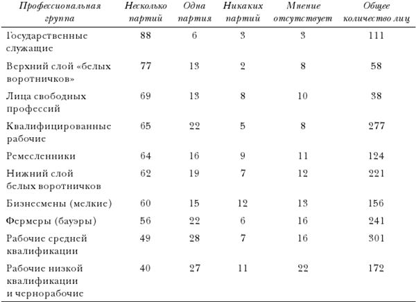 Данные опросов общественного мнения в целом ряде стран указывают, что низшие классы намного меньше привязаны к демократии как политической системе, чем городской средний и высший классы. В Германии, например, при обследовании, проведенном Институтом ЮНЕСКО в Кёльне в 1953 г., была опрошена систематическая выборка из 3000 немцев, которым задали следующий вопрос: «Думаете ли Вы, что было бы лучше, если бы существовала только одна партия, несколько партий или вообще не было бы никаких партий?» Результаты, проанализированные в соответствии с профессиональным статусом респондентов, говорят о том, что низшие страты рабочего класса и сельского населения с меньшей вероятностью поддержали бы многопартийную систему (этот показатель считается разумным индексом демократических установок в западных и вестернизованных странах), нежели это сделали бы средняя и верхняя страты (см. табл. I).