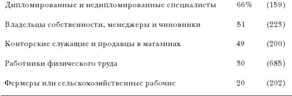 Данные, полученные при опросах общественного мнения в тринадцати разных странах и показывающие, что низшие страты меньше привержены демократическим нормам, нежели средние классы, вновь подтверждаются исследованиями ученых, которые были в большей мере ориентированы на психологические аспекты и изучали социальные корреляты «авторитарной личности»[146]. Многие исследования в этой области, результаты которых были недавно сведены воедино, показывают устойчивую увязку между авторитаризмом и принадлежностью к низшему классу[147]. По итогам одного из опросов, охватившего 460 лос-анджелесских взрослых, сообщается, что «среди рабочего класса содержится более высокая пропорция сторонников авторитаризма, чем среди представителей как среднего, так и высшего классов» и что среди работающих те лица, которые явным образом идентифицировали себя как принадлежащие к «рабочему классу», а не к «среднему классу», были более авторитарными[148].