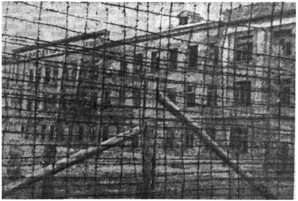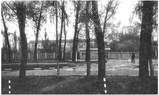 Часть двора на уровне женской половины первого этажа была отгорожена от мужской рядами колючей проволочной ограды. Одним концом ограда примыкала перпендикулярно к дому, другим – к внешней ограде, которая, как и в Житомире, состояла из трех рядов колючей проволоки на высоких столбах с «кольцами Бруно» между рядами. Вышек не было.