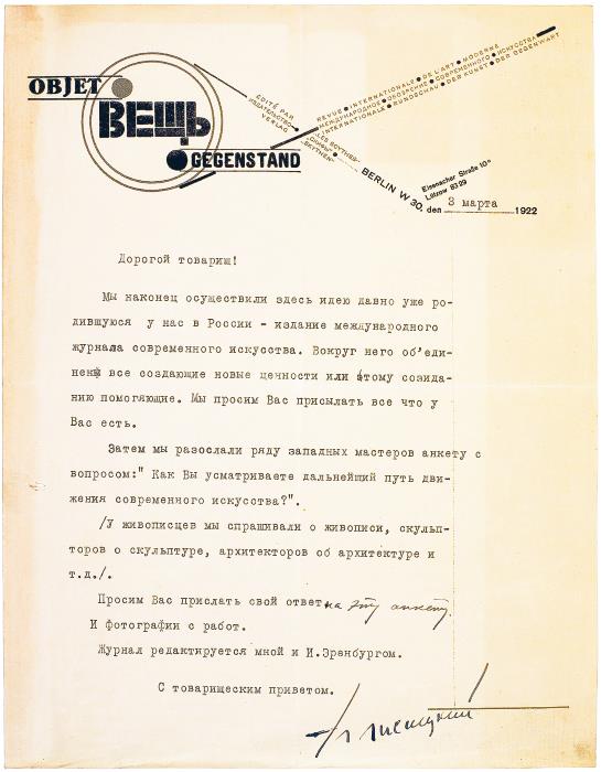 Эль Лисицкий. Фирменный бланк журнала «Вещь». Декларация издательского направления. 1922