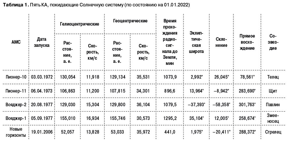 Все четыре КА в результате встреч с планетами развили скорости, достаточные для того, чтобы навсегда покинуть Солнечную систему. «Вояджер-1» является лидером этого парада. 6 августа 2020 г. он ушел от Солнца на 150 астрономических единиц, то есть оказался от него в 150 раз дальше, чем Земля. Это самый далекий космический аппарат, когда-либо запущенный в космос человеком (см. таблицу 1), и конкурентов ему, по крайней мере в ближайшие десятилетия, не предвидится.