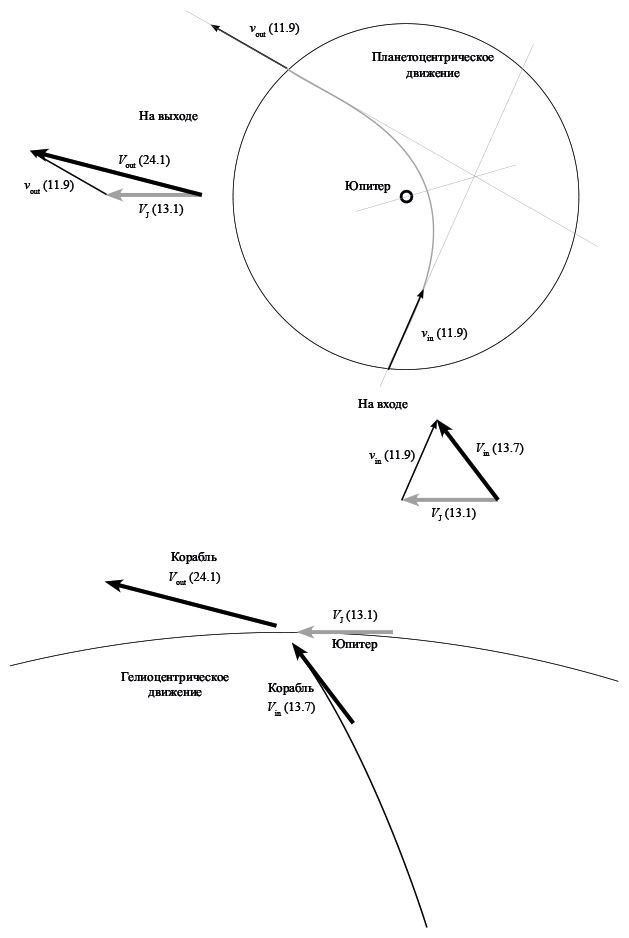 Допустим, мы летим от Земли на межпланетном корабле по орбите с афелием около 9 а.е., пересекающей орбиту Юпитера на расстоянии 5,2 а.е. от Солнца. Более того, мы выбрали траекторию так, что пройдем вблизи Юпитера, но все же не попадем в него. (Не пытайтесь проделать это в реальности – там очень мощная радиация!) Чтобы понять в первом приближении, что из этого получится, разделим наш путь на три части: до входа в сферу действия планеты, внутри этой сферы и после выхода из нее. Снаружи мы считаем единственным притягивающим центром Солнце, а внутри – только Юпитер.