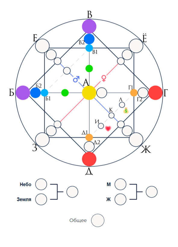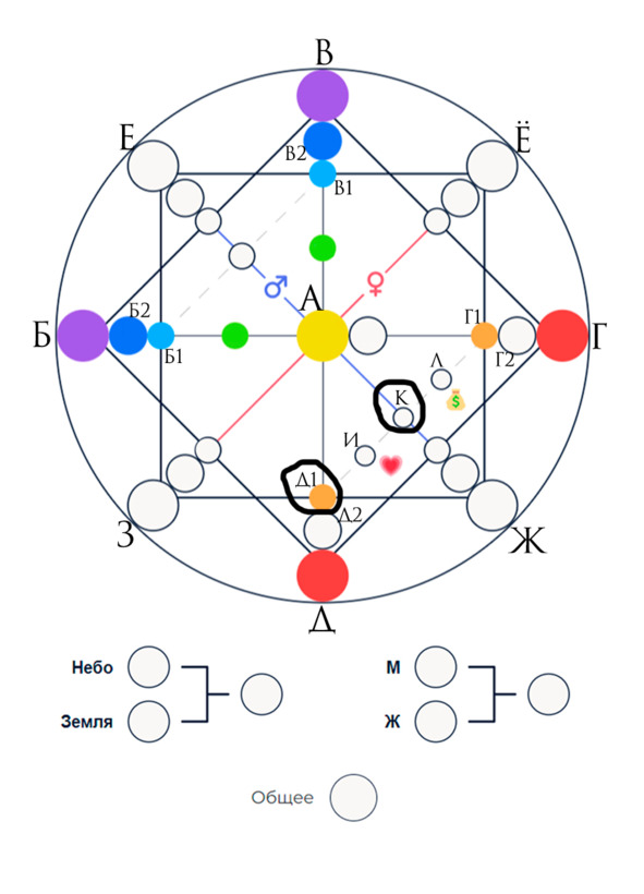 Точки Г и Д также могут читаться в совокупности и показывать основные проблемы пары в материальном и духовном плане. Точка Д – главная задача, а точка Г – отношение к материальному. В совокупности они показывают, что пара может делать не так, от чего отношения ухудшаются.