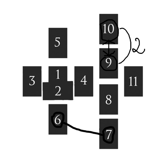 Читать столбец 6—1 и 5—2 нужно едино т.е. все три карты нужно соединять в один рассказ. (Если сейчас вам сделать это сложно, прочитайте главу про чтение раскладов без позиций).