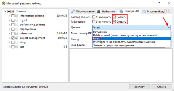 Возможны и другие варианты, которые выбираются из выпадающего списка. Например, можно не выгружать инструкции создания базы и таблиц, но выгрузить инструкции удаления старых данных и добавления новых (рис.1.41).