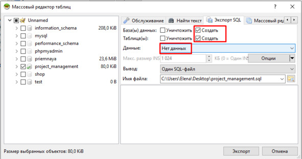 Бывают ситуации, когда нужна только структура базы с пустыми таблицами. В этом случае настройки будут такими, как на рис.1.40.