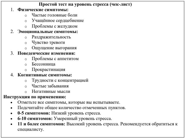 Чек-листы позволяют быстро оценить, испытываете ли вы высокий уровень стресса, и определить основные области, на которые он влияет. Вот пример такого теста: