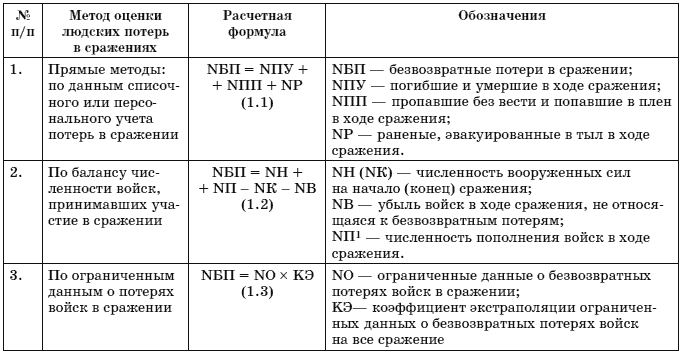 Расчетные формулы методов оценки безвозвратных людских потерь в сражениях[2]