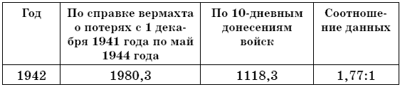 Потери по 10-дневным донесениям войск и по балансу численности вермахта с 22 июня 1941 года по 31 мая 1942 года приведены в табл. 1.4. Численности вермахта по годам войны заимствованы из таблицы, приведенной на странице 330 книги генерал-майора вермахта Буркхарта Мюллера-Гиллебранда «Сухопутная армия Германии. 1939–1945», т. 3. Буркхарт Мюллер-Гиллебранд не указывает даты, на которые подсчитаны численности вермахта, но сравнивая численности действующей армии, приведенные в таблицах на страницах 82 и 330 его книги, можно предположить, что численности вермахта в таблице на странице 330 даны на середину соответствующего года. Численность мобилизованных в вермахт взята из таблицы, приведенной на странице 329 труда Б. Мюллера-Гиллебранда.