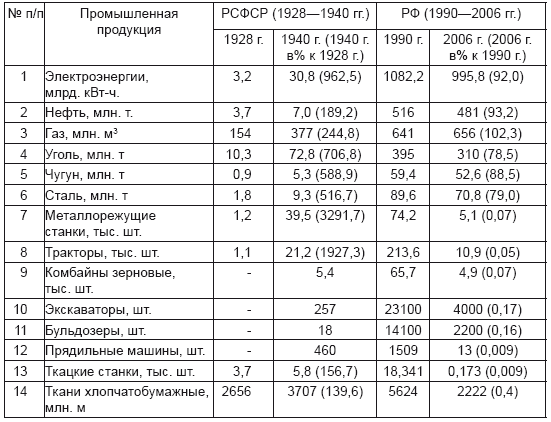 Таблица 1.3. Промышленная продукция в РСФСР (1928–1940 гг.) и РФ (1990–2006 гг.)