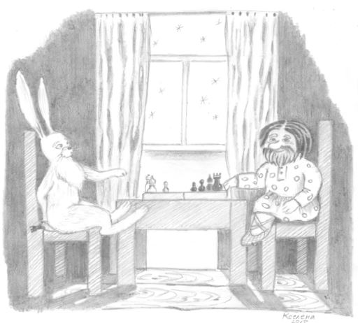– Ээээ, нет! Ишь, какой хитренький! – возразил Коська. – Почему это я играю за чёрных? Я ведь сам белый! И заяц показал лапкой на свою белоснежную шубку.