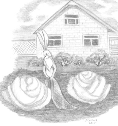 А было это поздней осенью. Ты, наверное, знаешь, что не далеко от нашей дачи есть лес. В том лесу-то и живёт заяц Коська. Летом он разные ягодки да грибы собирал – тем и питался. А тут – дело идёт к зиме: ни грибов, ни ягод в лесу уже нет. Холодно и голодно стало косому. Что делать? Хочешь-не хочешь, а надо где-то еду себе добывать. Вот и поскакал Коська из леса в сторону домов, что виднелись на пригорке. И как раз оказался возле нашей дачи. Пролез он осторожно под старыми воротами и огляделся по сторонам. Дом был молчалив: все уехали в город, остался один Домовой – за хозяйством приглядывать. Видит заяц – нет никого, обрадовался! И сразу направился в огород, а там – капуста растёт! Да какие кочаны сбитые, большие – дедушкина гордость! У Коськи глаза разбежались от такого изобилия. Присел он возле одного кочана и давай капустные листики обрывать и есть. А как голод утолил, ну, прыгать по грядкам да выбирать, где капустный листик повкуснее да посочнее, тот и в рот кладёт! Наелся до отвала! Пролез под воротами и поспешил обратно в лес. На завтра снова в огород собрался да мешок с собой прихватил: мол, что не доем, то в мешке-то и унесу. Быстро он так по знакомой дорожке добрался до заветного места! Но только косой расположился на грядке, как вдруг кто-то как крикнет: