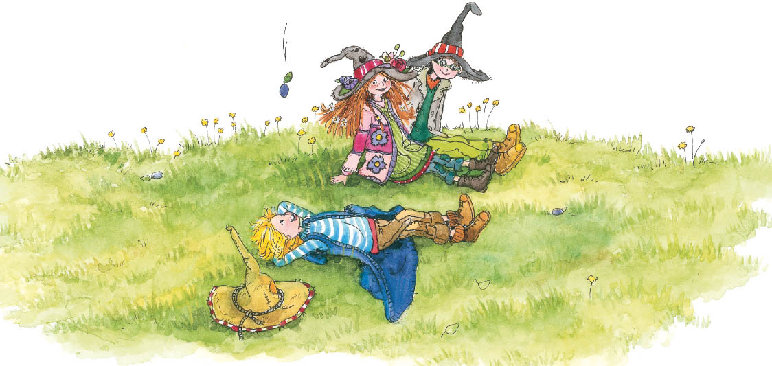 „Fliegen wir nach Hause“, sagte Laurus. Malte, Hille und Flora nickten. Es sah nach Regen aus. Nach diesem Abenteuer würde es jetzt richtig gemütlich sein, in Floras Zimmer zu sitzen, Tee zu trinken und Hexenquartett zu spielen.