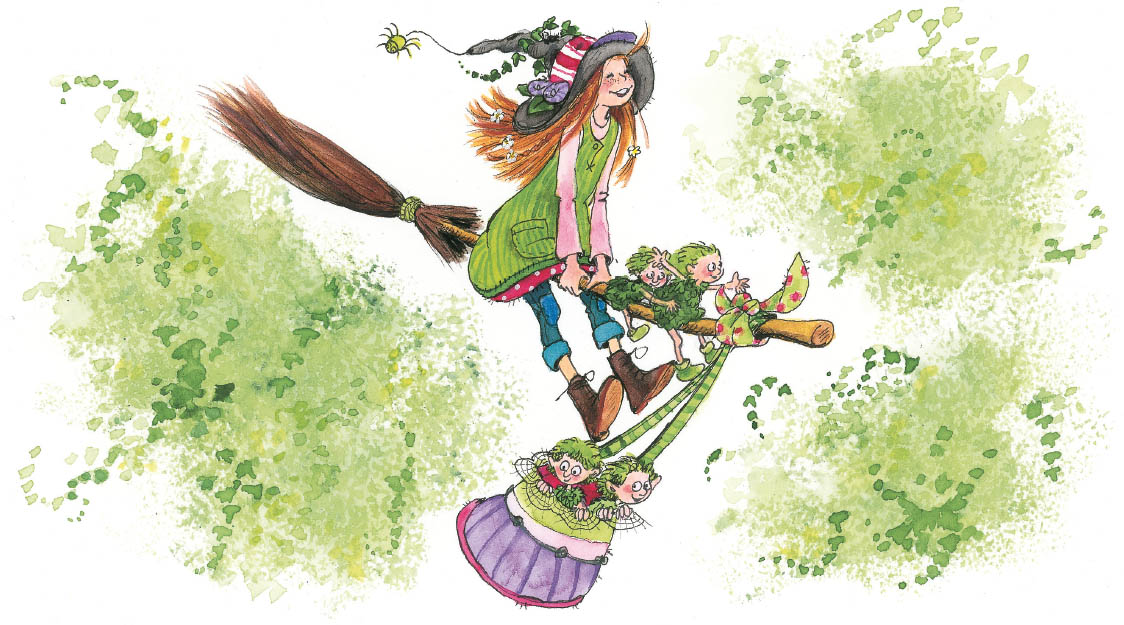Flora sah sich verwundert um. Aus dem Gebüsch kamen ein paar kleine grüne Kobolde gekrochen. Kringel sprang aus dem Beutel, tapste nach kurzem Zögern näher und schnupperte an den Kobolden. „Du bist die Besenflitzerin-in“, sagten die Kobolde alle zusammen.
