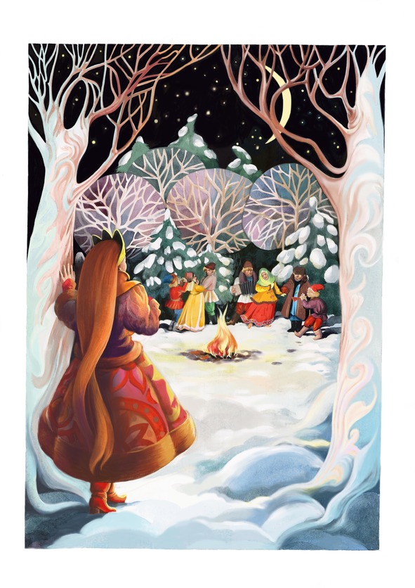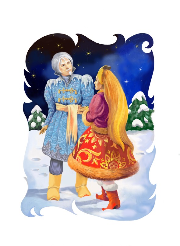 Трудно сказать, долго ли вели её извилистые пути, но именно там, где деревья сошлись в непроходимую глухую стену и преградили путь огромные сугробы, повстречался ей молодой Мороз. Он был такой красивый в роскошном расшитом жемчугом и каменьями кафтане, что Звёздочка даже затаила дыхание, рассматривая его, а он шёл, её не видя, осматривал лес и напевал: