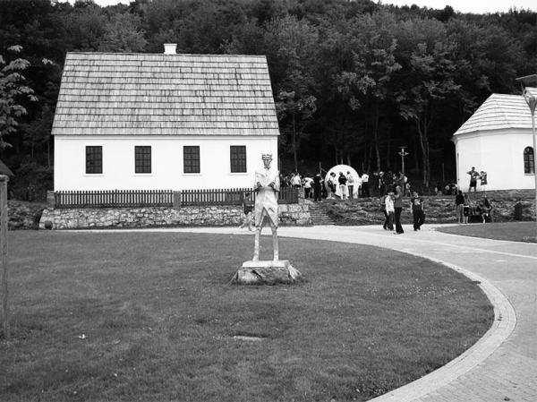 Рис. 2. Так этот домик выглядит в наши дни. Дом-музей Теслы в деревне Смиляны и памятник великому изобретателю