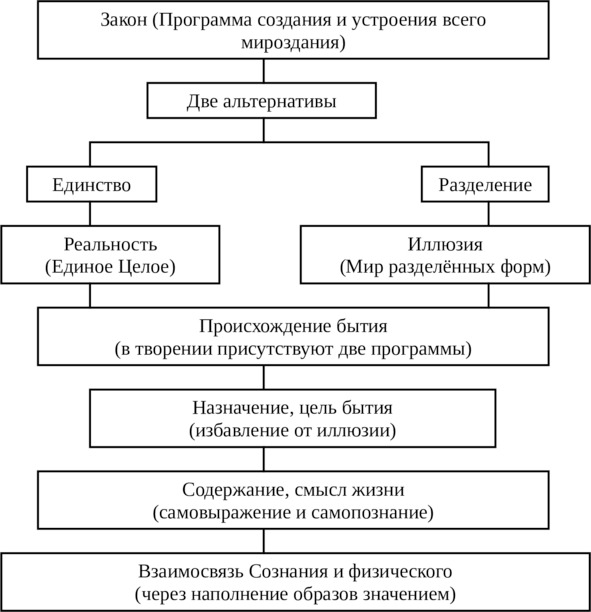 В общем случае программа творческого самовыражения Разума (Сознания) может устраивать иллюзорную бытия, – но не с точки зрения его устройства, а лишь с позиции . Фундаментально Закон Единства, собственно, и отражающий реальность естества Разума (Сознания), быть исключён и заменён на разделение, поскольку реализация разделения как в конечном счёте приводит к абсолютному небытию. Это необходимо понять очень чётко, иначе Разум (Сознание) не избавится от попыток совмещения законов Единства и разделения, а в учениях и теориях – от попыток совмещения соответствующих образов и терминологии, что по сути своей принципиально несовместимо! То есть, в итоге в Разуме (Сознании) должно победить (быть осознанно выбрано) что-то одно: либо Единство, Жизнь и Бытие, либо разделение, смерть и абсолютное небытие. Неосознанное стремление к совмещению несовместимого удерживает Разум (Сознание) в иллюзии разделённого самовосприятия, что порождает Его «нескончаемые» виртуальные страдания, «неразрешимые» противоречия и кажущуюся безысходность. картину принципов интерпретации наблюдений не может принципа устройства