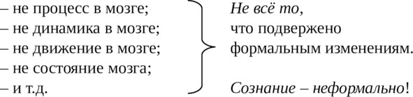 Путаница теорий о Сознании (физикализм, теории тождества, функционализм, дуализм, панпсихизм, мистерианство) обусловлена опорой на́ (точнее, верой в́…) реальность материи. Мы до сих пор воспринимаем материю реальной, тогда как материя есть самовыражения Сознания. Искать реальность бесполезно, как и физический объект на бумажной карте, на видео или фотографии. Изображение не есть сам объект, так и образ – не Сознание. Корреляция психического и физического (то есть сознания и тела) представляется проблемой только потому, что физическое (или материальное) считается несомненной объективной реальностью, а сознание – субъективной реальностью, причём ! Но сто́ит отнять у материи (тела) статус объективной реальности, и всё встанет на свои места. Логическая (каузальная, причинная) связь между сознанием (или психическим) и телом (физическими процессами) устанавливается посредством Законов Мироздания, являющихся самовыражением Сознания. Иначе говоря, картина физического мира есть состояния Сознания. В этом и состоит решение психофизиологической проблемы: психическое и физиологическое представления описывают формальный (протекающий в форме) информационный процесс, но форма , а сущности, которая есть Сознание. Всякая форма есть текущее отождествление Сознания, или Его самовыражение, или Его представление о том, «Кто Я». Отличие Сознания от бессознательных процессов: чувственного восприятия, категоризации, дискриминации, принятия решений, переживания, мышления и т. д. – в том, что все эти процессы нужно . Сознание нуждается в от иллюзии формальных отождествлений, или в осознавании, что никакая отдельная форма и даже совокупность всех форм «Я», а есть лишь образное самовыражение, , но не Реальность! Пока Сознание отождествляется материальной или ментальной формой, включая Эго (эготипический ум), – Оно пребывает в иллюзорном сне, в плену форм. Всякое изменение в образе обусловлено изменением состояния Сознания в процессе познания Самоё Себя. Однако изменение в образе может произойти лишь тогда, когда меняется , то есть Сознание освобождается от иллюзии разделения и всё более приближается к осознаванию собственной Единой Реальности. Таким образом, восприятие материи объективной реальностью (вследствие веры в идею разделения) – это «жизнь в сказке», свидетельствующая о незрелости понимания. Сознание, безусловно, участвует в причинных отношениях в мироздании: оно определяет сущность (смысл, содержание) и ценность всего (всякого образа). Без сознания ничто не имеет смысла (содержания), ни ценности, всё одинаково пусто. 17 только образ в образе сомнительной информационный образ не сущность образ осознать пробуждении не есть ошибка самовосприятия хоть с одной закон