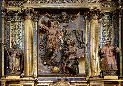 Fig. 9. Francisco Rincón, Anunciación, relieve central del retablo mayor; el retablo estaba pagado en 1606. Valladolid, iglesia penitencial de Ntra. Sra. de las Angustias.