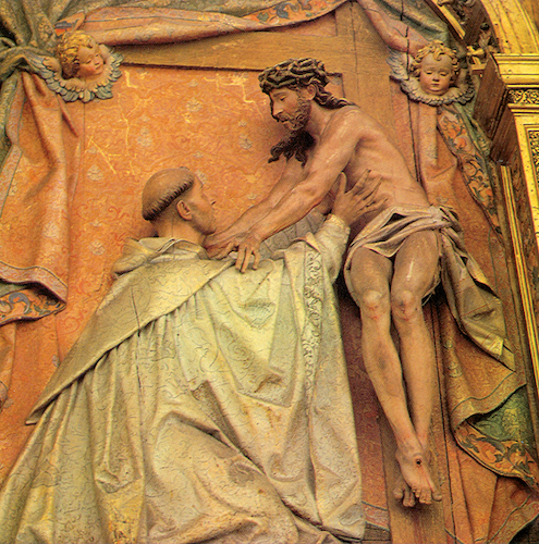 La creciente fama que el taller empieza a cosechar dentro y fuera de Valladolid avala la gran actividad que se documenta en el período comprendido entre 1611 y 1615, donde ya el artista recoge y potencia el testigo del giro que había experimentado hacia el naturalismo en la etapa precedente. La actividad se ejemplifica a través de los retablos que contrata. El mayor de la catedral de Miranda do Douro —que inicia en 1610— constituye una de las obras más espléndidas de la imaginería castellana para el marqués de Lozoya, y destaca por la escena principal con la Asunción de la Virgen concebida como un gigantesco cuadro. En el de Villaverde de Medina (Valladolid, 1612) sobresale el relieve del Nacimiento. Y en el mayor del convento de las Huelgas Reales de Valladolid, cuya escultura contrata Gregorio Fernández en 1613, descuella la imagen de Cristo desclavándose de la cruz para abrazar a san Bernardo; se trata de uno de los temas místicos más queridos por la Orden Bernarda, donde el escultor dio sobradas muestras del naturalismo con el que concibe la figura de Cristo, casi de bulto redondo. La coincidencia de la composición con la obra de Ribalta conservada en el Museo del Prado y titulada Visión de San Bernardo, hizo pensar a Martín González en el uso de un grabado por ambos artistas, realizado por Hieronymus Wierix según Palomero Páramo[127], la escena constituye una obra maestra (Fig.13), a caballo entre el misticismo y el naturalismo. En la clausura de este mismo monasterio se conserva el bellísimo relieve con el Nacimiento de Cristo, obra también de Fernández, que doña Isabel de Mendoza mandó ejecutar para su capilla privada, siguiendo las directrices del retablo mayor que también había costeado.