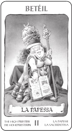 На роскошном плюшевом ковре терракотового оттенка стоит преисполненная самозначимости рыжеволосая Жрица – Бетэйль. Правой рукой она указывает на текст в громадной раскрытой книге с картинками, стоящей у её ног. Левой – держит высокий красный жезл. Ковер за ее спиной накрывает нечто, напоминающее постамент или алтарь.