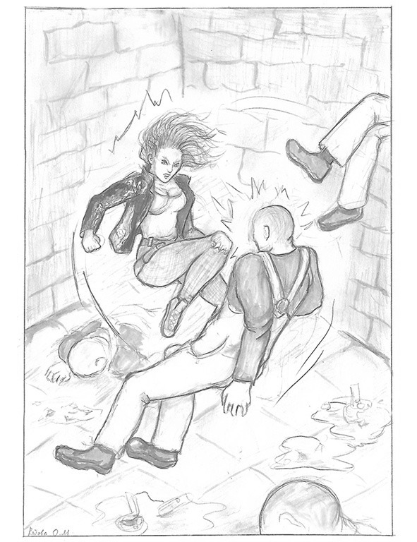Вскоре они достигли некоей давно поставленной в петли, открывающейся со скрипом, двери, за которой находились ступени, ведшие вниз. Тут царила кромешная тьма – без фонарей можно заблудиться – и это надолго. После спуска снова шёл небольшой тёмный коридор, затем опять ступенчатый спуск, а в итоге – вновь дверь, на этот раз металлическая, на вид обыкновенная, но открывающаяся лишь при помощи сканирования сетчатки глаза. За нею Мария и К2 увидели огромный зал, освещённый многочисленными яркими, но компактными лампами. Посреди зала стояли несколько столов с техникой и бумагами. Возле этих столов и частично на них сидели и стояли какие-то люди. Когда Мария и К2