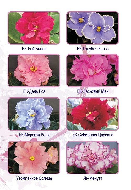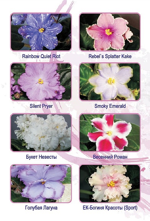 Существуют одноцветные и многоцветные сорта сенполий. Среди многоцветных можно выделить следующие группы: каемчатые, фантазийные и «химеры».