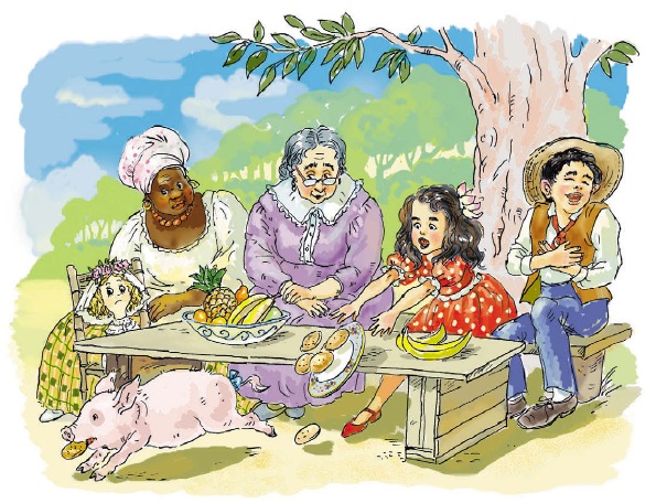 Педриньо накрыл праздничный стол под апельсинным деревом в саду и рассадил гостей: тут были донна Бента, тётушка Настасия и родственники Эмилии, представленные разными камушками, обломками черепиц и комочками хлеба. Пригласили и старого родственника донны Бенты, который иногда приезжал из города, но так как сегодня он не приехал, то вместо него на стул посадили палку.