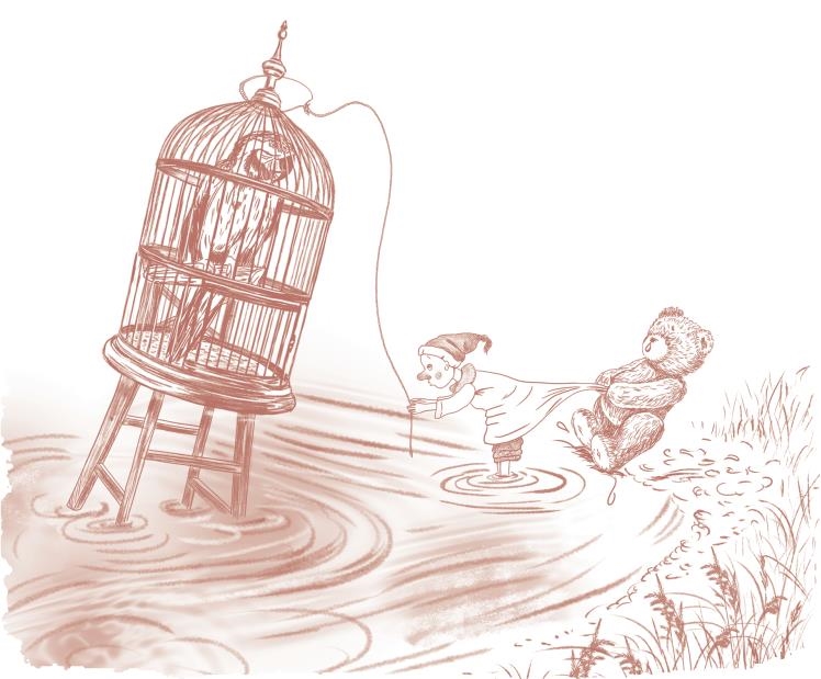 На этот раз наводнение несло высокий детский стульчик. На нём стояла позолоченная клетка, а в ней… попугай! Он бил крыльями и голосил: