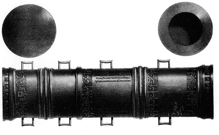 После отливки гигантское орудие перетащили в конец Красной площади, к Москворецкой переправе, туда, где лежала большая 16-тонная бомбарда «Павлин» 1555 г. Гипертрофированные сведения о гигантских размерах пушек уже содержатся в описаниях путешественников конца XVI – начала XVII в. Большая площадь, по словам Хуана Персидского, секретаря посольства шаха Аббаса I в 1599–1600 гг., была заставлена огромными пушками, «такими огромными, что два человека могли входить в каждую для чистки ее»[102].